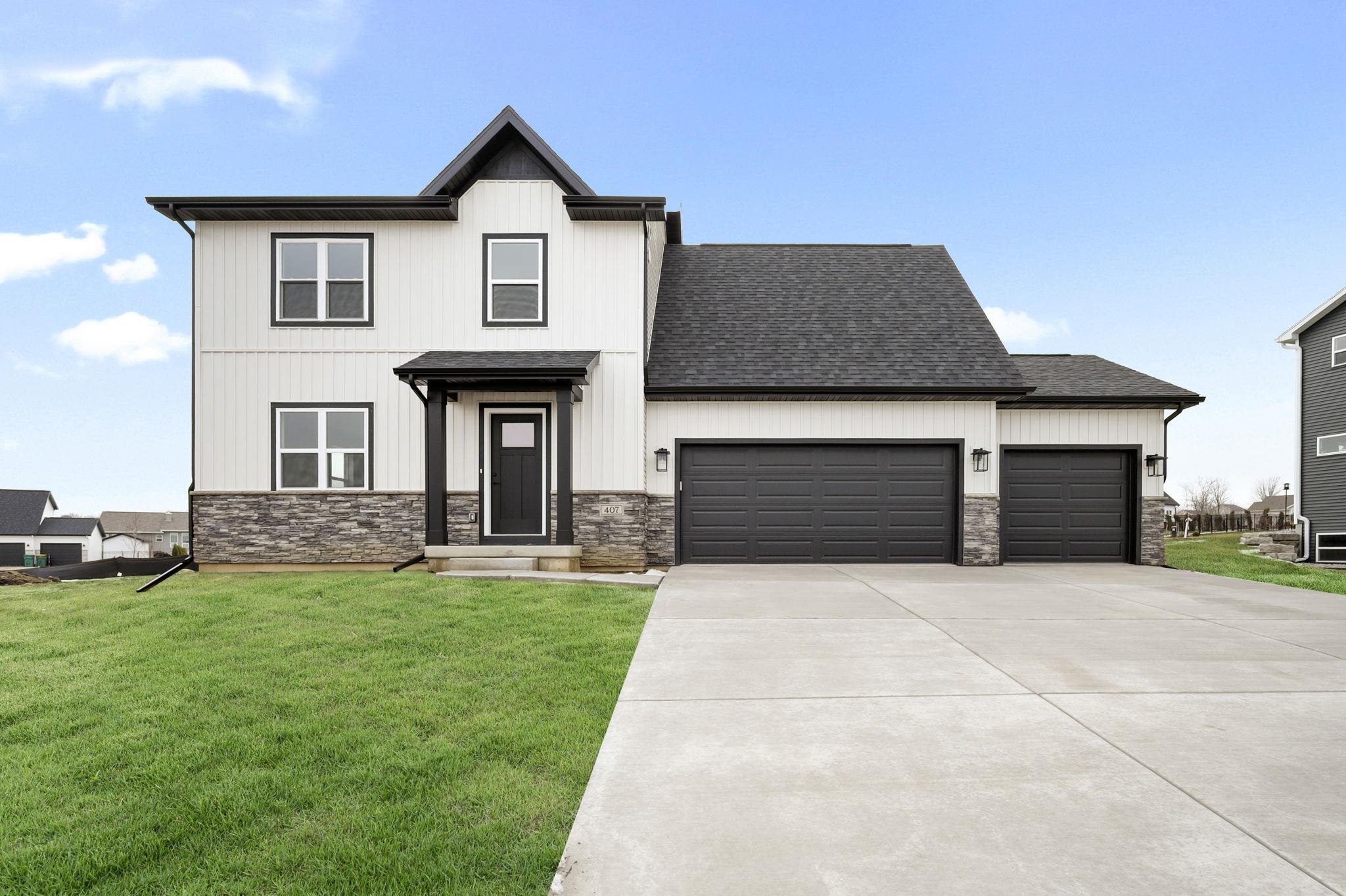 New construction home with estimated December completion! This beautiful Farmhouse style half duplex offers first-floor primary suite and laundry room off the kitchen! This home features three bedrooms, two and a half bathrooms, and a 2-car garage. You'll be welcomed by high ceilings in the great room and an open concept kitchen and living space. The well-appointed kitchen boasts modern appliances, ample cabinetry, and quartz countertops, perfect for preparing meals and entertaining guests. Unfinished lower level for storage or finishing in the future with an egress window, and rough-in plumbing for a future bathroom. Home comes with a limited-transferable warranty!